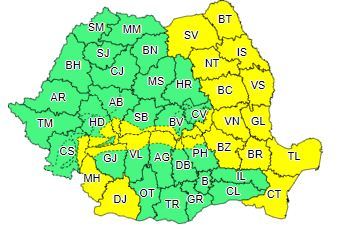 Judeţele vizate de noua atenţionare sunt: Suceava, Iaşi, Neamţ, Bacău, Vaslui, Alba, Argeş, Brăila, Botoşani, Braşov, Buzău, Caraş-Severin, Constanţa, Covasna, Dâmboviţa, Dolj, Gorj, Galaţi, Hunedoara, Mehedinţi, Prahova, Sibiu, Tulcea, Vâlcea şi Vrancea.