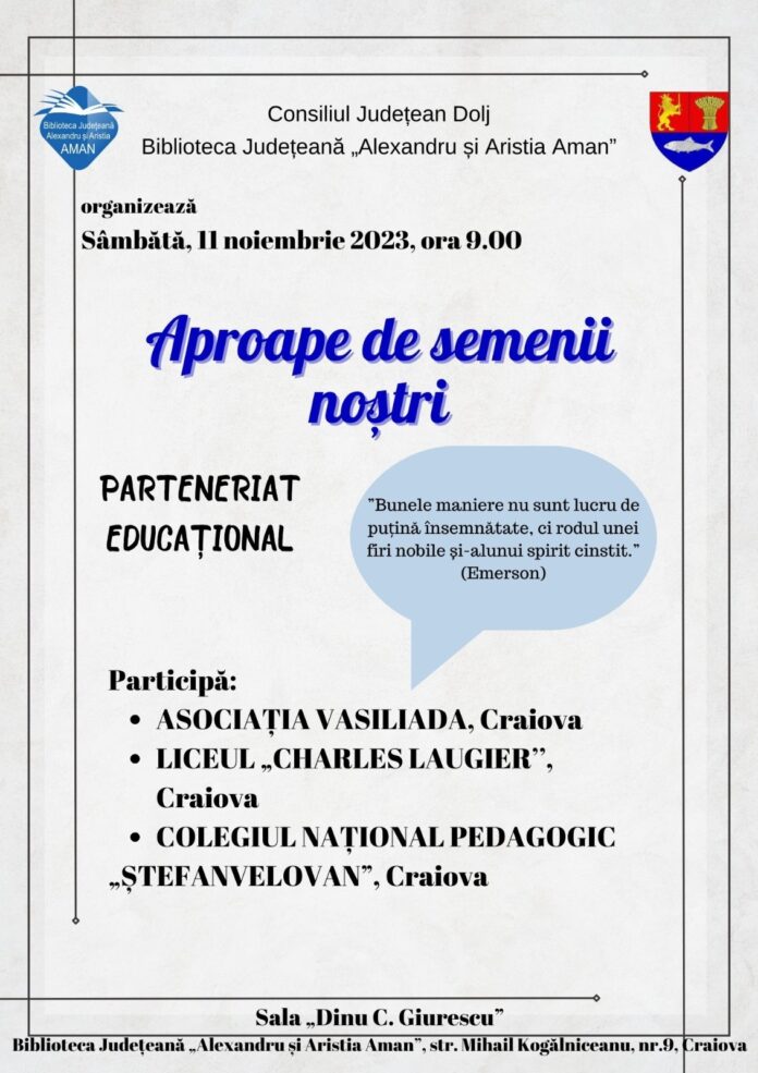 Biblioteca Județeană „Alexandru și Aristia Aman” organizează în parteneriat cu Asociația Vasiliada, Colegiul Naţional Pedagogic „Ştefan Velovan”, și Liceul „Charles Laugier’’ din Craiova, evenimentul Aproape de semenii noștri.