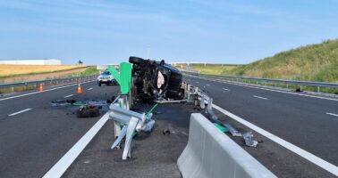 deplasare, a lovit parapetul de separare a sensurilor și s-a răsturnat.