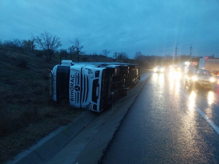 Trafic restricționat pe DN 65F – Centura de Nord a Craiovei, după ce un TIR s-a răsturnat.