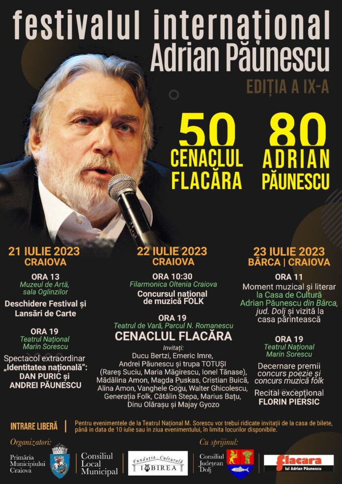 Muzica și poezia își dau, din nou, întâlnire la Craiova, în perioada 21 – 23 iulie 2023, la cea de-a IX-a ediție a Festivalului Internațional Adrian Păunescu.