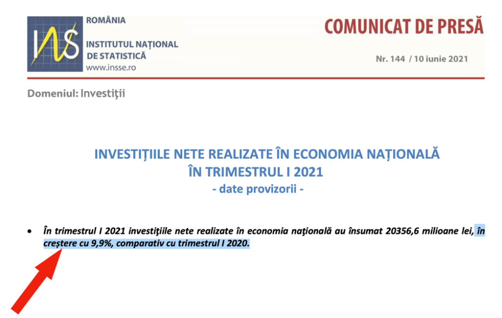 Investițiile NETE în economie cresc cu aproximativ 10%.