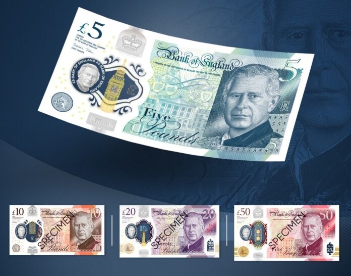 Portretul suveranului britanic va apărea pe bancnote din poliester în valoare de 5, 10, 20 şi 50 de lire sterline şi vor circula în paralel alături de cele care conţin portretul regretatei regine Elisabeta a II-a.