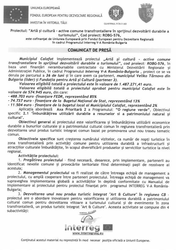 Primaria Municipiului Calafat lanseaza marti, 20 noiembrie, Proiectul ”Arta si cultura – active comune transfrontaliere in sprijinul dezvoltarii durabile a turismului”. Evenimentul are loc maine, 20.11.2018, ora 11, in incinta Casei de Cultura a Municipiului Calafat.