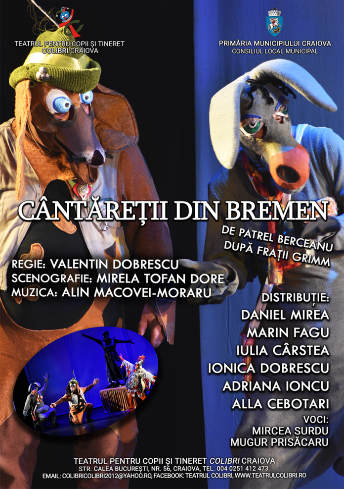 Teatrul pentru copii și tineret Colibri Craiova revine în Parcul „Nicolae Romanescu“, în cadrul Târgului de Paște, vineri, 21 aprilie, ora 19:00, la Teatrul de vară, pentru a dărui publicului bucuria întâlnirii cu spectacolul „Cântăreții din Bremen“, dramatizare de Patrel Berceanu după Fraţii Grimm, regia artistică Valentin Dobrescu, muzica Alin Macovei – Moraru, scenografia Mirela Tofan Dore, coregrafia Lelia Vais, cu actorii: Daniel Mirea, Marin Fagu, Iulia Cârstea, Ionica Dobrescu, Adriana Ioncu, Alla Cebotari; voci: Mircea Surdu, Mugur Prisăcaru.
