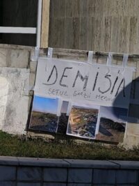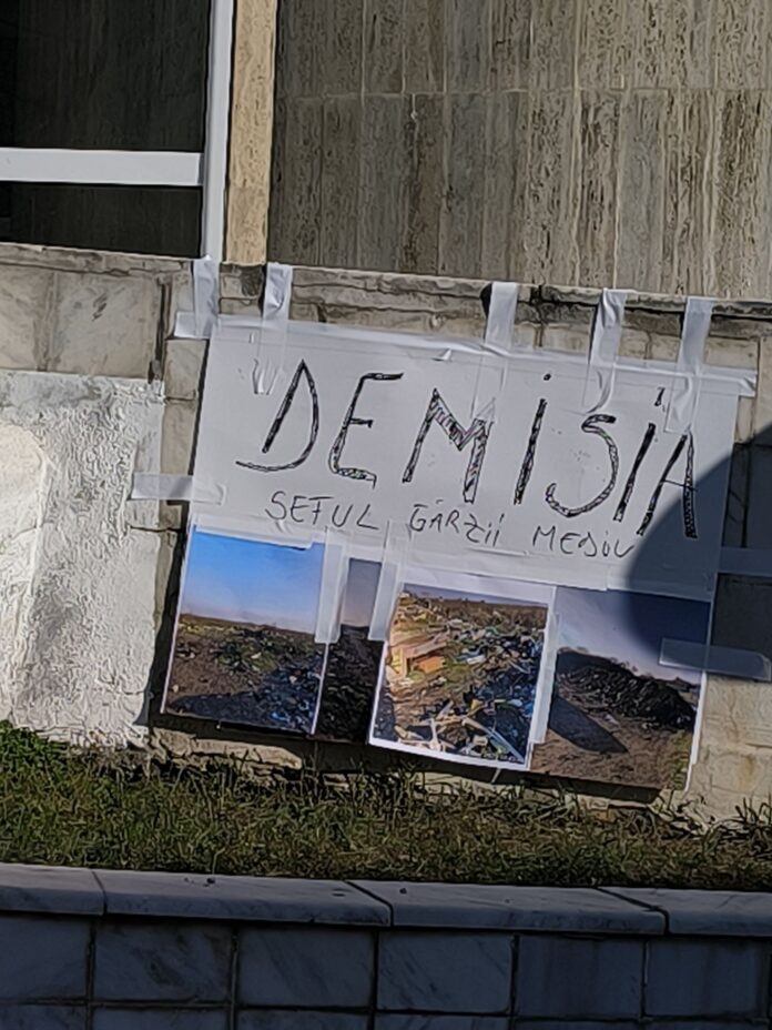Astfel, în fața sediului instituției a fost amplasată o pancartă pe care este scris mesajul: „Demisia șefului Gărzii de Mediu Dolj”.