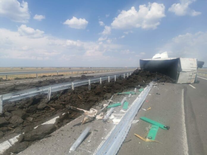 Un autotren încărcat cu cărbuni s-a răsturnat pe carosabil, in urma cu putin timp, pe Drumul Expres Craiova Pitesti, la kilometrul 38+700 de metri.