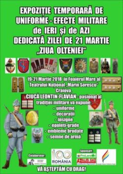 Realizate cu sprijinul instituțiilor din subordinea Primăriei Craiova și a Consiliului Județean Dolj, expozițiile unicat de costume folclorice, uniforme militare, artă fotografică și postere din Craiova primului Război Mondial își vor aștepta vizitatorii în Foaierul Teatrului Național Marin Sorescu de luni, 19 martie până miercuri inclusiv, 21 martie 2018.